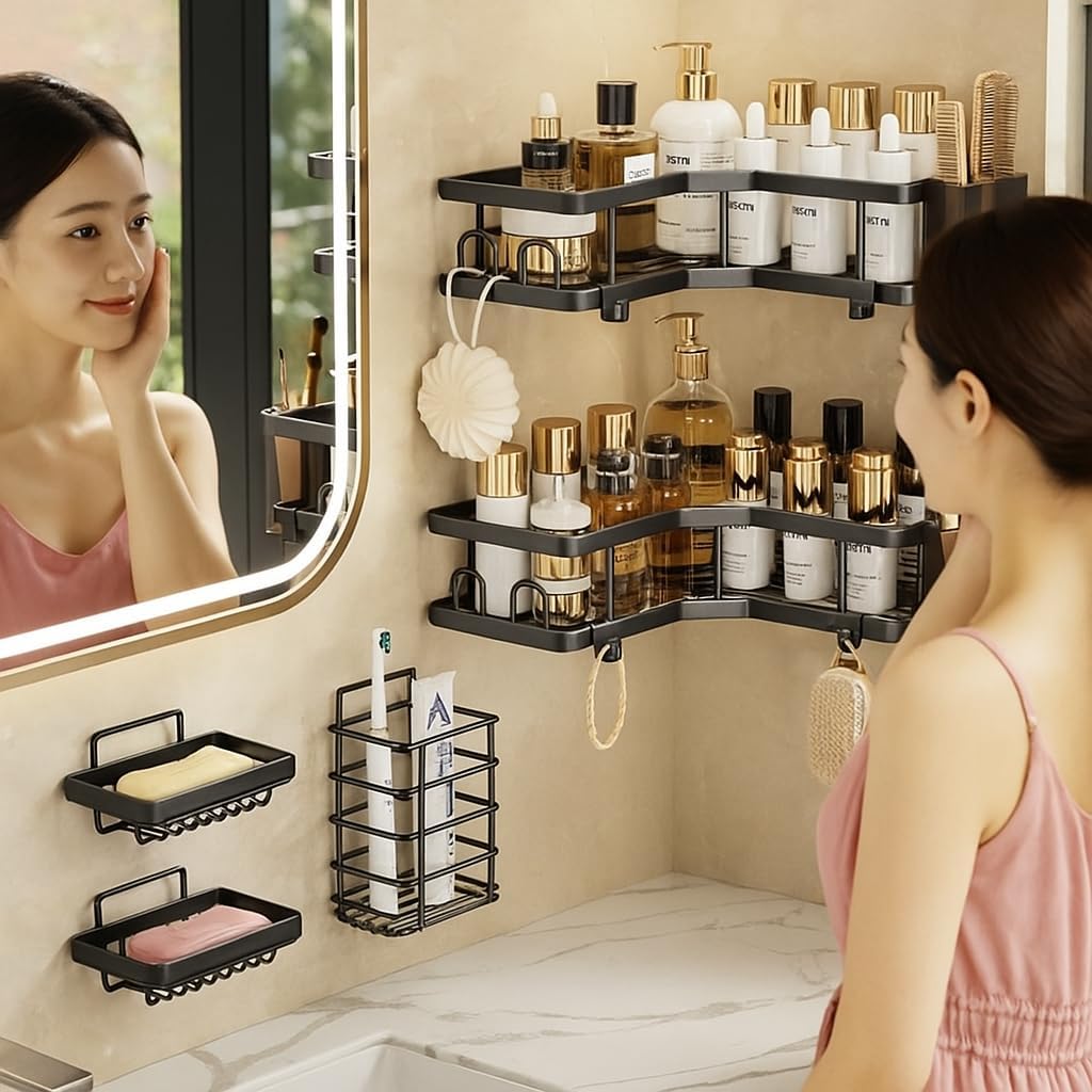 طقم رفوف الحمام الذكي 5 في 1 هو الحل المثالي لتنظيم كل مستلزماتك في مكان واحد. مصمم ليمنح حمامك أناقة وترتيب مع استغلال ذكي للمساحات.